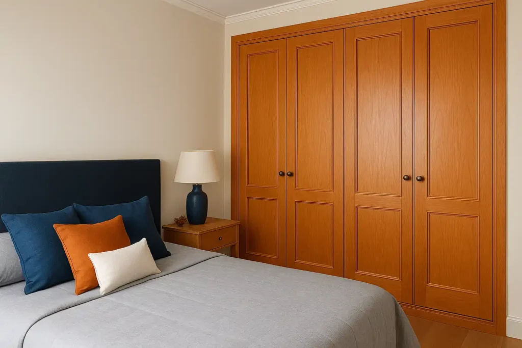 Renovación completa de armarios empotrados en viviendas de Alcobendas. Puertas abatibles clásicas disponibles en cualquier madera y color. Ideal para dormitorios principales con aprovechamiento máximo del espacio vertical.