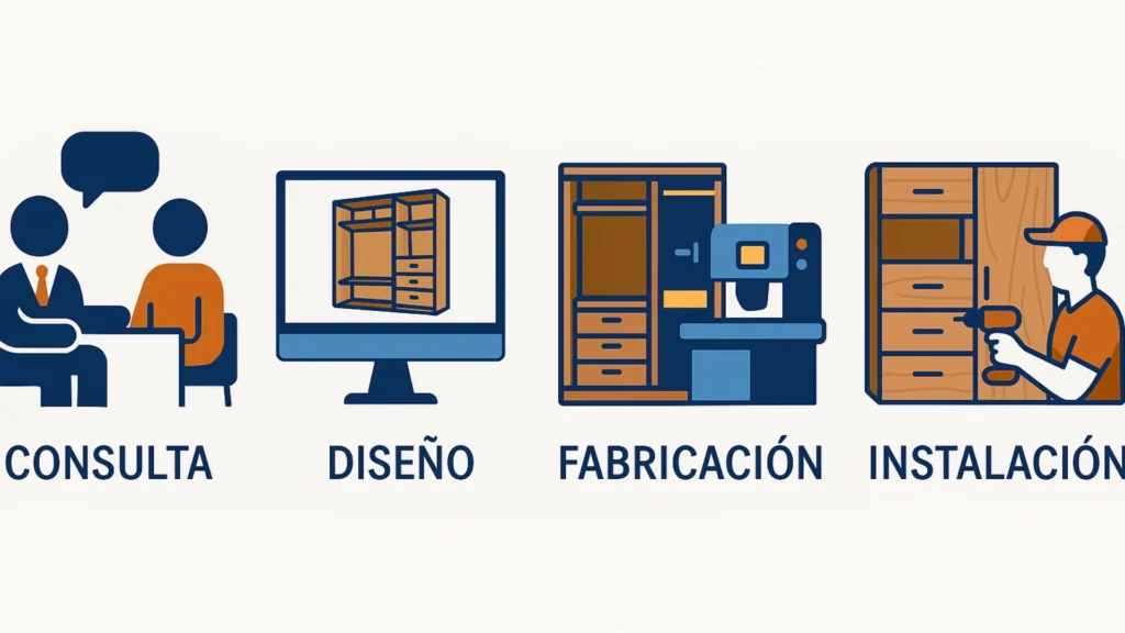 El proceso completo (diseño, fabricación e instalación) toma entre 3-4 semanas para un vestidor estándar. Incluye visita inicial, diseño 3D, aprobación del cliente, fabricación en nuestro taller e instalación profesional.