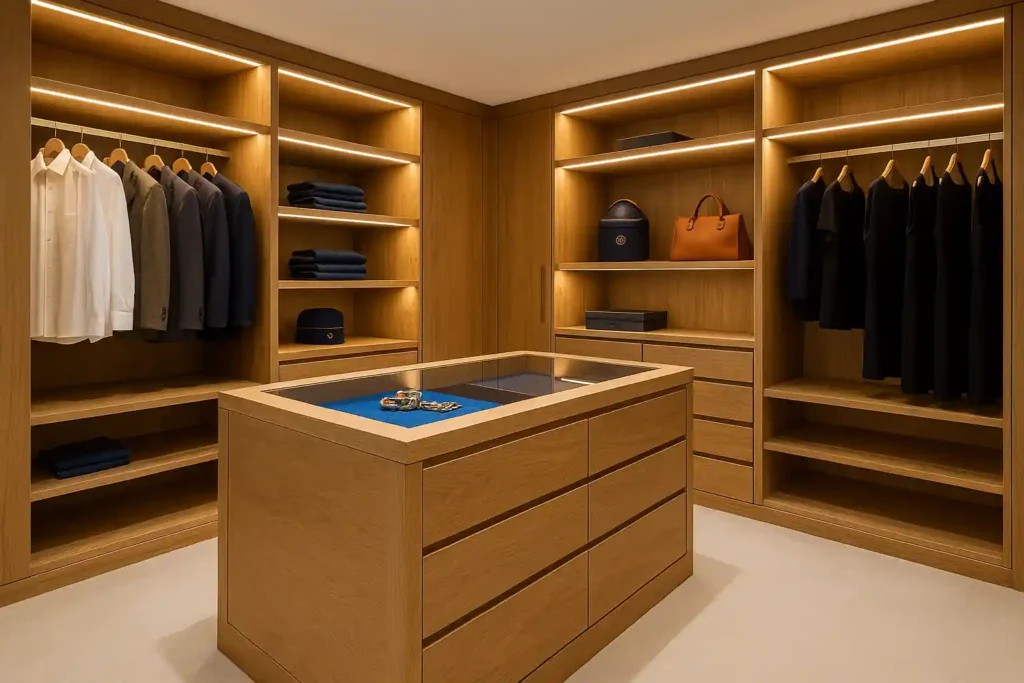 Espacios únicos para viviendas de alto standing en La Moraleja y zona norte. Vestidores completos con isla central, iluminación LED integrada, espejos y complementos. El sueño de cualquier hogar moderno.